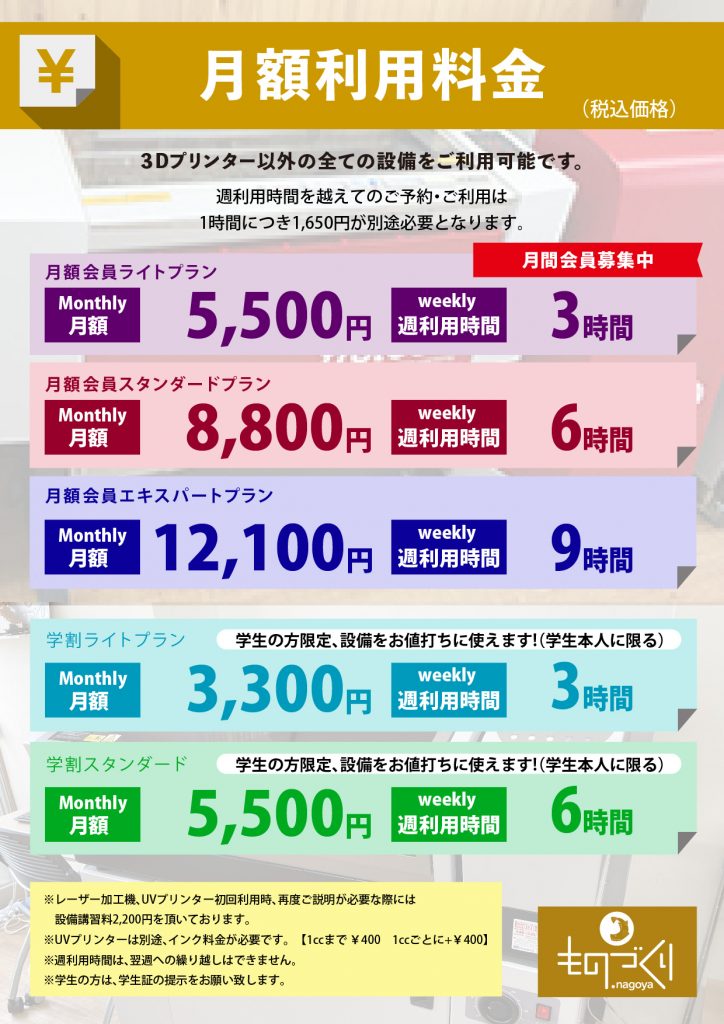ものづくり.nagoyaでは、時間貸設備料金・月額会員料金と大きく二つの料金体系がございます。