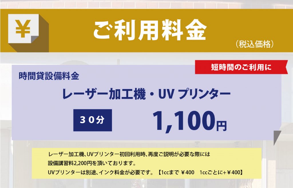 ※レーザー加工機・UVプリンターの初回利用時、再度ご説明が必要な際に設備講習料2,200円を頂いております。予めご了承下さい。